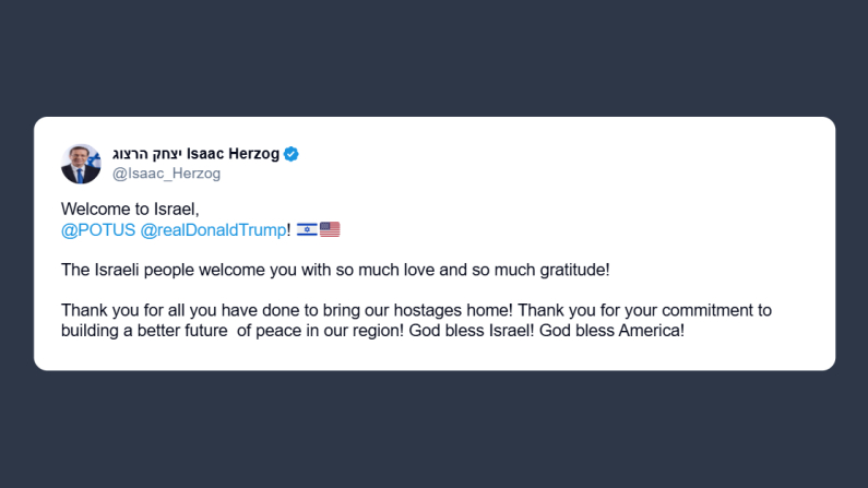 Il presidente israeliano, Isaac Herzog, ha dato il benveuto in Israele al presidente degli Stati Uniti Donald Trump. Sul proprio profilo X, Herzog ha ringraziato Trump per «tutto ciò che ha fatto per riportare a casa i nostri ostaggi: Grazie per il tuo impegno nel costruire un futuro migliore di pace nella nostra regione».