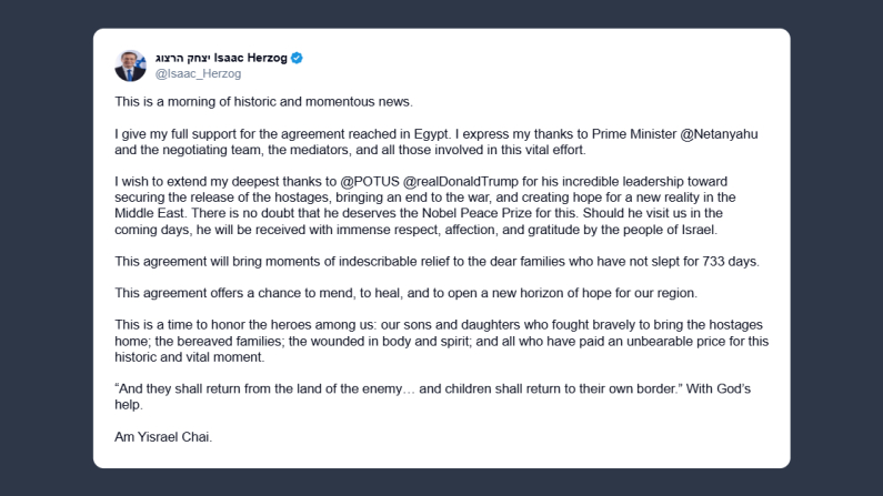 Il presidente israeliano, Isaac Herzog, ha scritto su X: «È una mattina di notizie storiche e straordinarie. Esprimo il mio pieno sostegno all’accordo raggiunto in Egitto. Grazie al primo ministro Benjamin Netanyahu e al presidente Donald Trump per gli sforzi nel garantire la liberazione degli ostaggi, porre fine alla guerra e creare speranza per un nuovo futuro in Medio Oriente. Non c’è dubbio che meriti per questo il Premio Nobel per la Pace».