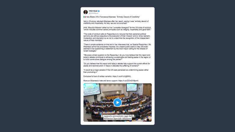 Hillel Neuer, avvocato internazionale specializzato in diritti umani, ha scritto ieri su X: «Italia contro la relatrice Onu Francesca Albanese. Rapporto del tutto privo di credibilità. L’ambasciatore italiano all’Onu ha respinto il rapporto di Albanese, definendolo del tutto privo di credibilità e imparzialità. Come Italia, non ne siamo sorpresi. L’ambasciatore Maurizio Massari ha denunciato il suo totale disprezzo per il codice di condotta Onu, che include principi di buon senso quali integrità, imparzialità e buona fede. Il codice di condotta invita i relatori a “garantire che le opinioni politiche personali non pregiudichino l’esecuzione della missione” e a “mostrare moderazione, prudenza e discrezione per non compromettere il riconoscimento della natura indipendente del mandato”. Esistono numerose prove online e nelle sue interviste che dimostrano come, in qualità di relatrice speciale, la signora Albanese non possa essere considerata imparziale. In un recente evento pubblico in Italia sembrava persino mettere in discussione una dichiarazione del sindaco locale che chiedeva il rilascio degli ostaggi israeliani. Poniamo una domanda diretta alla relatrice. Ritiene davvero che questo rapporto e il dibattito odierno contribuiscano a raggiungere una pace sostenibile e duratura nella regione o a costruire un dialogo costruttivo tra le parti? Crede che questo rapporto e il dibattito odierno aiutino a sostenere gli sforzi attuali per la pace e la ricostruzione a Gaza o ad alleviare le sofferenze dei civili? Sarebbe un tragico paradosso se l’Onu fosse percepita come ostacolo alla pace invece che promotrice».