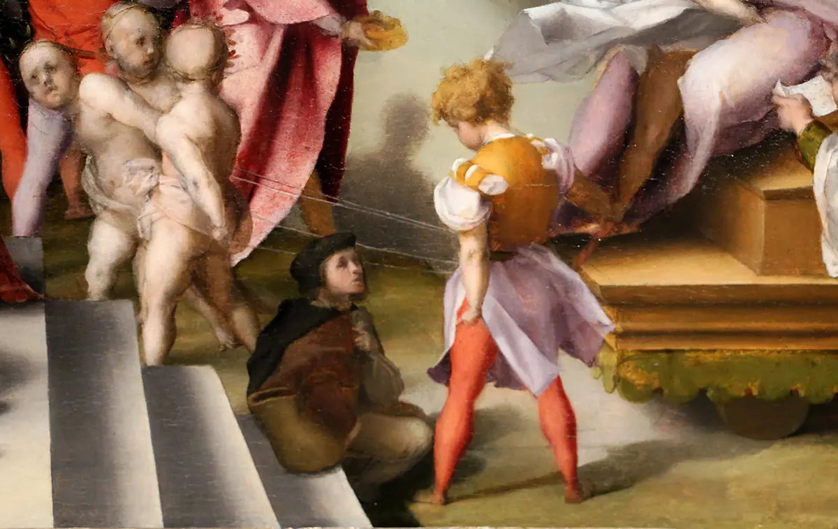 Oltre all’allusione al maestro, quest’opera riflette la continuità del lignaggio artistico. Si ritiene che raffiguri Agnolo Bronzino, allievo dello stesso Pontormo, diventato anch’egli un famoso pittore manierista. Il giovane Bronzino, seduto in primo piano sul gradino più basso del palazzo del Faraone, indossa un cappello nero e tiene un braccio sopra un cesto.