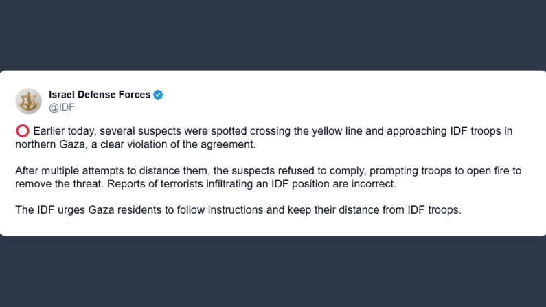 Le Forze di Difesa israeliane hanno scritto su X che questa mattina sono stati avvistati diversi «sospetti attraversare la linea gialla e avvicinarsi alle truppe delle Idf nel nord di Gaza, in chiara violazione dell’accordo. Dopo numerosi solleciti, i sospetti si sono rifiutati di obbedire, spingendo le truppe ad aprire il fuoco per neutralizzare la minaccia. Le notizie di terroristi che avrebbero infiltrato una posizione delle Idf sono inesatte». Le Idf, in conclusione, hanno esortano «i residenti di Gaza a seguire le istruzioni e a mantenere la distanza dallìesercito israeliano».