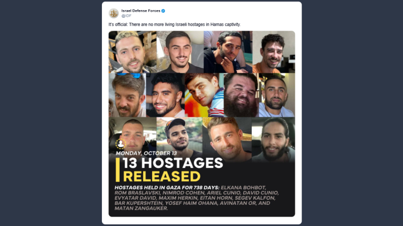 Le Forze di Difesa israeliane hanno scritto su X: «È ufficiale: non ci sono più ostaggi israeliani vivi in custodia di Hamas».