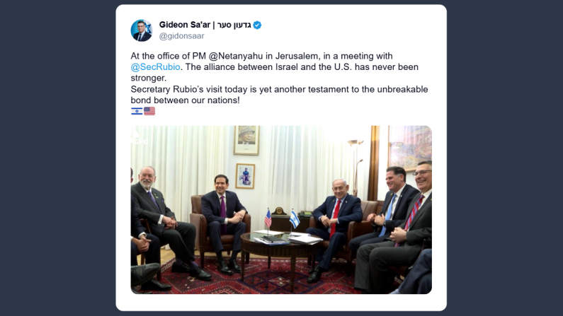 Il ministro degli Esteri israeliano, Gideon Sa’ar, ha scritto ieri su X: «nell’ufficio del primo ministro Benjamin Netanyahu a Gerusalemme, durante un incontro con il ministro degli Esteri Marco Rubio. L’alleanza tra Israele e Stati Uniti non è mai stata così solida. La visita di oggi del ministro Rubio è un’ulteriore testimonianza del legame indissolubile tra le nostre nazioni».