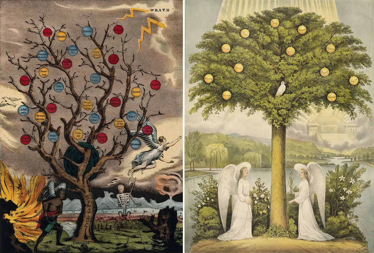 Currier & Ives, L’albero della morte, con frutti dei peccati di orgoglio, lussuria ed egoismo. (Wellcome Images/ CC BY 4.0) E L’albero della vita, con frutti virtuosi di saggezza, temperanza e verità, 1892, di Currier & Ives. Pubblico dominio