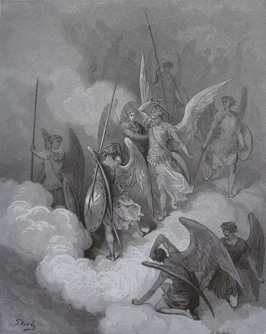 In quel momento, Abdiele sferra il primo colpo che si abbatte sullo scudo di Lucifero spingendolo indietro di dieci passi, Michele suona la tromba e la battaglia vera e propria ha inizio.