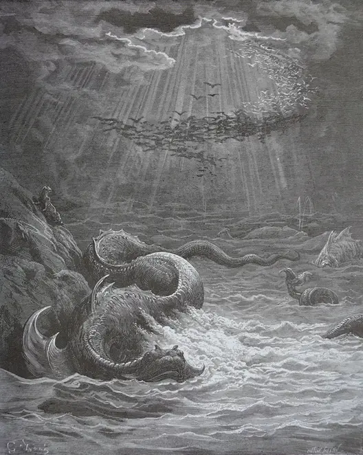 Doré illustra la descrizione della creazione di Milton: la luce viene separata dalle tenebre e l’acqua arriva sulla terraferma. La coesistenza di questi opposti fornisce l’ambiente di vita per ogni cosa, mentre emergono gli animali dell’acqua, della terra e del cielo. Le illustrazioni di Doré rivelano interpretazioni dinamiche e ricche di contrasti dell’esuberanza della natura nel suo stato puro. A esempio, Onda dopo onda, dove si incontrano; / Se ripide, con impeto torrenziale, mostra l’acqua, che riflette la luce del cielo, che scorre attraverso rocce scoscese e cade dall’alto delle nuvole. Non si vede ancora nessuna creatura.