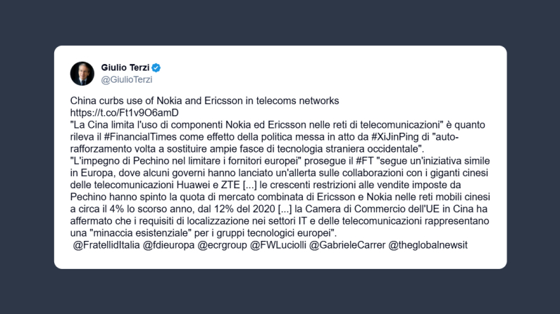 «’L’impegno di Pechino nel limitare i fornitori europei’ prosegue il Financial Times ‘segue un’iniziativa simile in Europa, dove alcuni governi hanno lanciato un’allarme sulle collaborazioni con i giganti cinesi delle telecomunicazioni Huawei e ZTE […] le crescenti restrizioni alle vendite imposte da Pechino hanno spinto la quota di mercato totale di Ericsson e Nokia nelle reti mobili cinesi a circa il 4% lo scorso anno, dal 12% del 2020 […] la Camera di Commercio dell’Ue in Cina ha affermato che i requisiti di localizzazione nei settori It e delle telecomunicazioni rappresentano una ‘minaccia esistenziale’ per i gruppi tecnologici europei».