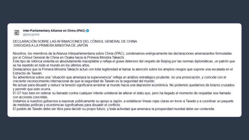 L’Alleanza interparlamentare sulla Cina (Ipac), coalizione che riunisce oltre 300 parlamentari di 35 Paesi per contrastare le minacce del regime comunista cinese, ha scritto su X: «dichiarazione sulle minacce del console generale cinese rivolte al presidente del Consiglio giapponese. Noi, membri dell’Alleanza interparlamentare sulla Cina (Ipac), condanniamo con la massima fermezza le dichiarazioni minacciose rivolte dal console generale cinese a Osaka al presidente del Consiglio Sanae Takaichi. Questo tipo di retorica violenta è assolutamente inaccettabile e testimonia il grave degrado del rispetto di Pechino per le norme diplomatiche, un fenomeno che si ripete ormai in tutto il mondo da anni. Ribadiamo che il presidente Takaichi ha agito in modo del tutto legittimo quando ha richiamato l’attenzione sui rischi enormi di un’escalation nello Stretto di Taiwan. Il suo monito su una “situazione che minaccia la sopravvivenza” è un’analisi strategica prudente, non una provocazione, e si allinea al crescente consenso internazionale secondo cui la sicurezza di Taiwan è la sicurezza del mondo intero. Non agire per dissuadere e ridurre la tensione significherebbe trascinare il pianeta in una depressione economica. Non possiamo restare con le mani in mano e permettere che accada. Il G7 ha fatto bene a ribadire l’appello contro ogni tentativo unilaterale di alterare lo status quo, ma ora è il momento di dare concretezza a quell’appello con azioni reali. Esortiamo i nostri Governi a manifestare pubblicamente sostegno al Giappone, a tracciare linee rosse chiare intorno a Taiwan e a coordinare un pacchetto significativo di misure politiche ed economiche per prevenire il conflitto. Il popolo di Taiwan deve essere libero di decidere il proprio futuro e ogni azione che metta a rischio la prosperità mondiale va fermata».