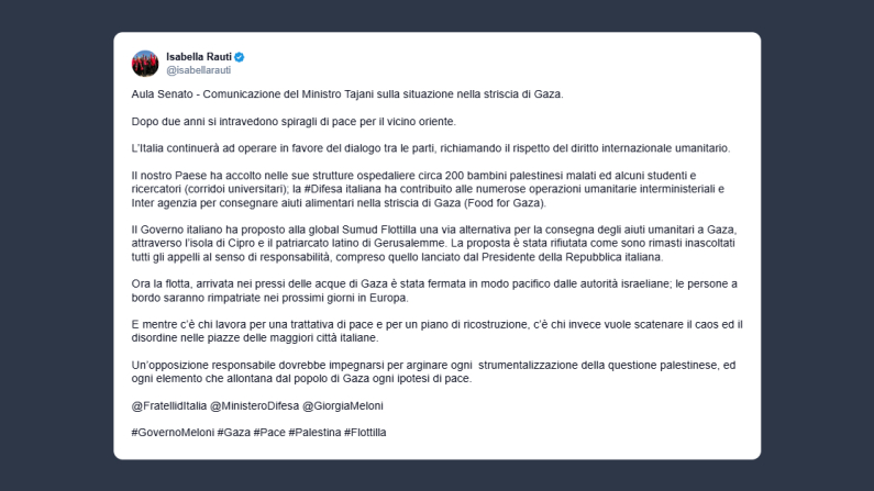 Il sottosegretario di Stato alla Difesa, Isabella Rauti, ha così commentato su X la comunicazione del ministro Tajani sulla situazione nella striscia di Gaza: «Tajani ha evidenziato che il Governo italiano ha proposto alla Global Sumud Flottilla una via alternativa per la consegna degli aiuti umanitari a Gaza, attraverso l’isola di Cipro e il patriarcato latino di Gerusalemme. La proposta è stata rifiutata, come sono rimasti inascoltati tutti gli appelli al senso di responsabilità, compreso quello lanciato dal Presidente della Repubblica italiana. Ora la flotta, arrivata nei pressi delle acque di Gaza è stata fermata in modo pacifico dalle autorità israeliane; le persone a bordo saranno rimpatriate nei prossimi giorni in Europa».