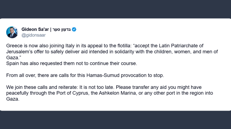Il ministro degli Esteri israeliano, Gideon Sa’ar, ha scritto su X che «La Grecia si unisce ora all’Italia nel suo appello alla flottilla» di accettare l’offerta del Patriarcato Latino di Gerusalemme di «consegnare in sicurezza gli aiuti» destinati a Gaza, sottolineando che persino «la Spagna ha chiesto alla flottiglia di non proseguire».