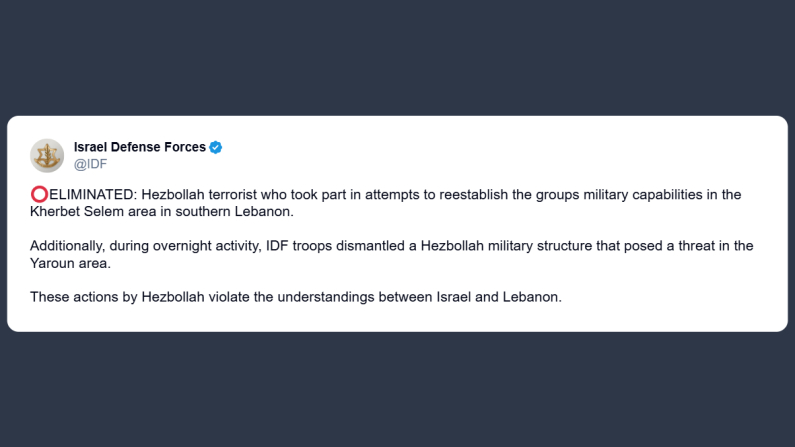 Le Forze di Difesa israeliane hanno scritto ieri su X: «eliminato un terrorista di Hezbollah coinvolto nei tentativi di ricostituire le capacità militari del gruppo nell’area di Kherbet Selem, nel sud del Libano».