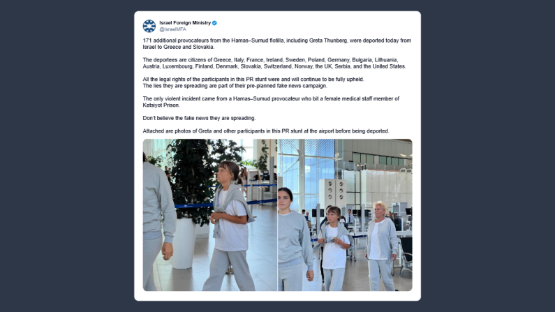 «Oggi, 171 provocatori della Hamas-Sumud Flotilla, tra cui Greta Thunberg, sono stati espulsi da Israele verso Grecia e Slovacchia. Gli espulsi sono cittadini di Grecia, Italia, Francia, Irlanda, Svezia, Polonia, Germania, Bulgaria, Lituania, Austria, Lussemburgo, Finlandia, Danimarca, Slovacchia, Svizzera, Norvegia, Regno Unito, Serbia e Stati Uniti. Tutti i diritti legali dei partecipanti a questa trovata mediatica sono stati e continueranno a essere pienamente rispettati».