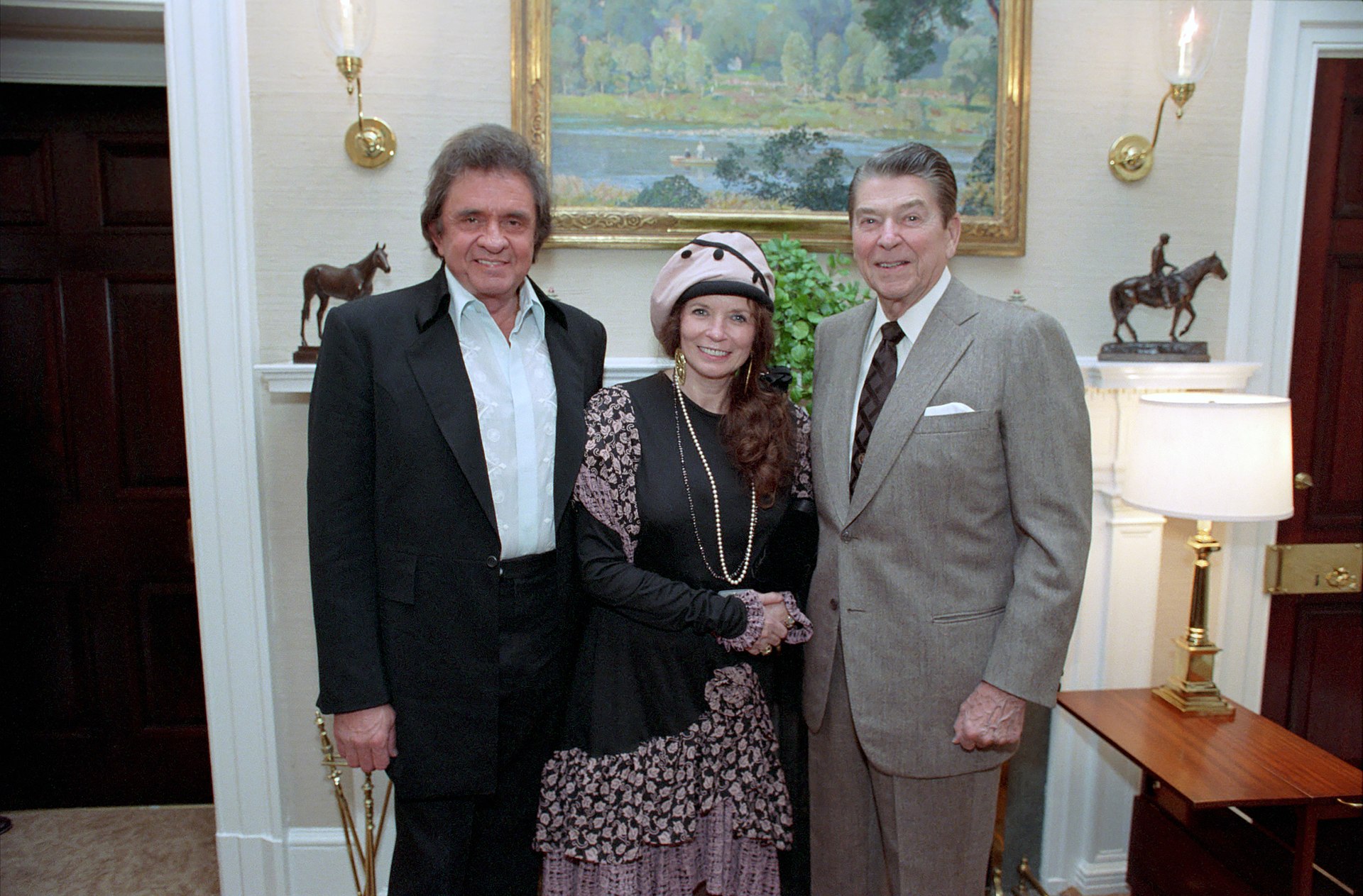 Il presidente Ronald Reagan con Jonny Cash e June Carter Cash nello Studio Ovale, 20 maggio 1988. Pubblico dominio