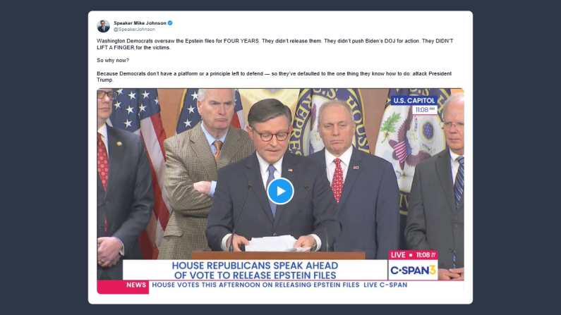 Il presidente della Camera dei deputati degli Stati Uniti, Mike Johnson, ha scritto ieri su X: «i democratici di Washington hanno tenuto nel cassetto i dossier Epstein per quattro anni. Non li hanno pubblicati. Non hanno spinto il ministero della Giustizia di Biden a fare nulla. Non hanno mosso un dito per le vittime. E allora perché proprio adesso? Perché i democratici non hanno più una piattaforma né un principio da difendere. L’unica cosa che sanno ancora fare è attaccare il presidente Trump».