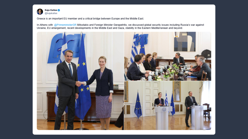 Il vicepresidente della Commissione europea e alto rappresentante per gli affari esteri, Kaja Kallas, ha dichiarato su X:«La Grecia è un membro importante dell’Unione europea e un ponte cruciale tra Europa e Medio Oriente. Ad Atene con il primo ministro Kyriakos Mitsotakis e il ministro degli Esteri Giorgos Gerapetritis abbiamo discusso di sicurezza mondiale, tra cui la guerra della Russia contro l’Ucraina, l’allargamento dell’Unione, gli ultimi sviluppi in Medio Oriente e a Gaza, nonché la stabilità nel Mediterraneo orientale e oltre».