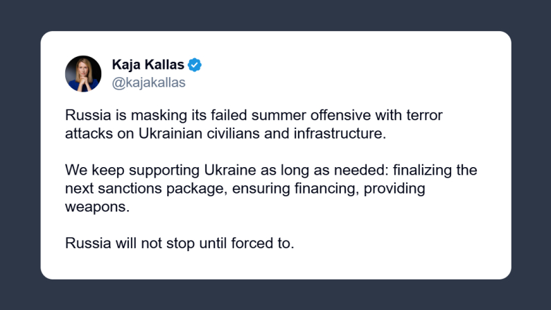 Il vicepresidente della Commissione europea, Kaja Kallas, ha scritto ieri in un post su X: «La Russia sta cercando di coprire il fallimento della sua offensiva estiva con attacchi terroristici contro civili e infrastrutture ucraine». La Kallas ha poi evidenziato che l’Ue continuerà a sostenere l’Ucraina per tutto il tempo necessario: «stiamo completando il prossimo pacchetto di sanzioni, garantendo finanziamenti e fornendo armi». «La Russia non si fermerà finché non sarà costretta a farlo», ha concluso il vicepresidente.