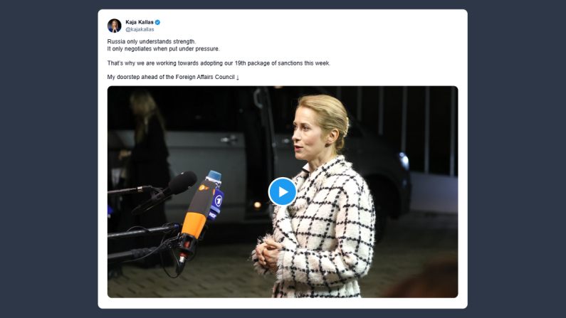 Il vicepresidente della Commissione europea, Kaja Kallas, ha dichiarato su X: «La Russia comprende solo la forza. Negozia solo quando è sotto pressione». La Kallas ha poi conlcuso: «Per questo stiamo lavorando per adottare il nostro diciannovesimo pacchetto di sanzioni entro questa settimana. La mia dichiarazione prima del Consiglio Affari Esteri».