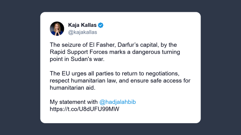 «La conquista di El Fasher, capitale del Darfur, da parte delle Forze di supporto rapido rappresenta una svolta pericolosa nella guerra in Sudan. L’Ue esorta tutte le parti a riprendere i negoziati, rispettare il diritto umanitario e garantire un accesso sicuro agli aiuti umanitari. Dichiarazione congiunta con Hadja Lahbib, commissario europeo per l’Uguaglianza, la Preparazione e la Gestione delle Crisi».