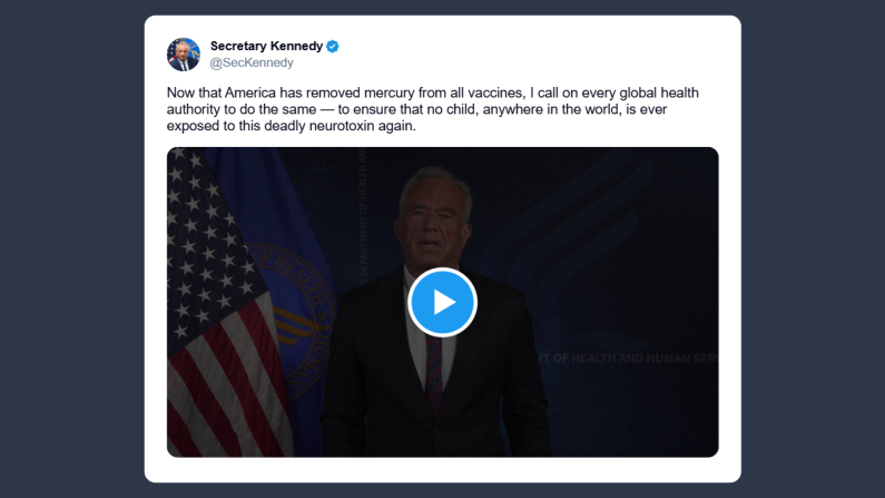 Il ministro della Salute americano, Robert F. Kennedy Jr, ha scritto ieri su X: «ora che gli Usa hanno eliminato il mercurio da tutti i vaccini, invito ogni autorità sanitaria mondiale a fare altrettanto per garantire che nessun bambino, in nessuna parte del pianeta, sia più esposto a questa neurotossina mortale».