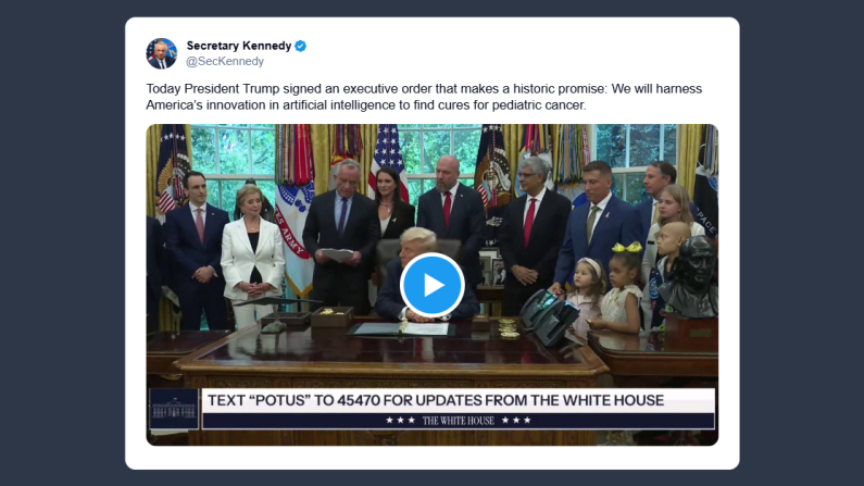 Il ministro della Salute americano, Robert F. Kennedy Jr., ha annunciato ieri su la firma dell’ordine esecutivo da parte di Trump, che «rappresenta una promessa storica: si sfrutterà l’innovazione americana nell’intelligenza artificiale per trovare cure per il cancro pediatrico».