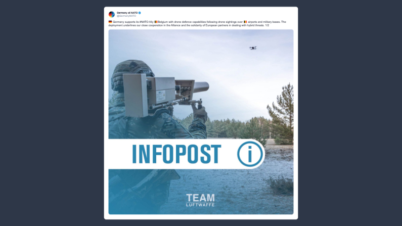 La delegazione tedesca presso la Nato ha scritto su X: «la Germania ha deciso di sostenere il suo alleato Nato, il Belgio, fornendo capacità di difesa anti drone, a seguito degli avvistamenti di droni su aeroporti e basi militari nel Paese. Questo dispiegamento sottolinea la nostra stretta collaborazione all’interno dell’alleanza e la solidarietà degli alleati europei nella gestione delle minacce ibride. Le prime unità avanzate dell’Aeronautica militare tedesca sono già giunte in Belgio per valutare la situazione e coordinare il dispiegamento temporaneo dei sistemi di rilevamento e difesa anti-drone con le Forze Armate belghe. Il corpo principale delle Forze seguirà a breve».