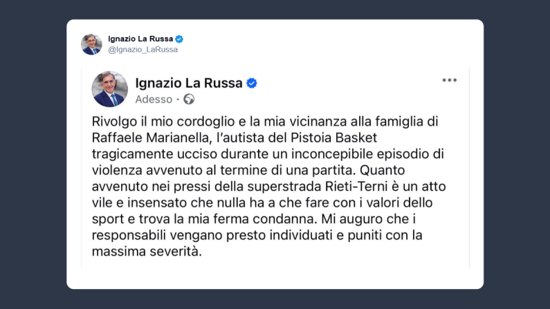 Il presidente del Senato, Ignazio La Russa, ha scritto su X: «rivolgo il mio cordoglio e la mia vicinanza alla famiglia di Raffaele Marianella, l’autista del Pistoia Basket tragicamente ucciso durante un inconcepibile episodio di violenza avvenuto al termine di una partita».