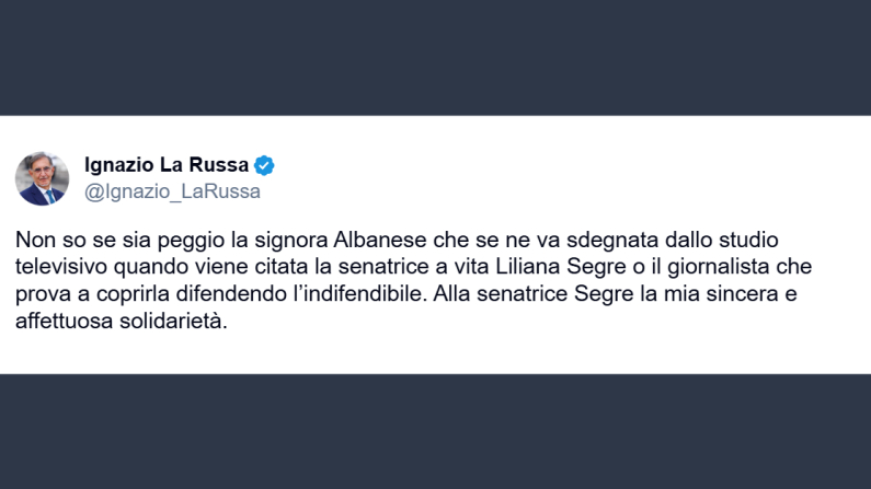 Il presidente del Senato, Ignazio La Russa, ha commentato su X l’abbandono dello studio della trasmissione di La7, In Onda, da parte della Relatrice speciale delle Nazioni Unite, Francesca Albanese. La Albanese ha lasciato lo studio quando il direttore di Historica edizioni, Francesco Giubilei, ha citato la senatrice a vita Liliana Segre. «Non so se sia peggio la signora Albanese che se ne va sdegnata dallo studio televisivo quando viene citata la senatrice a vita Liliana Segre o il giornalista che prova a coprirla difendendo l’indifendibile», ha detto La Russa. «Alla senatrice Segre la mia sincera e affettuosa solidarietà».
