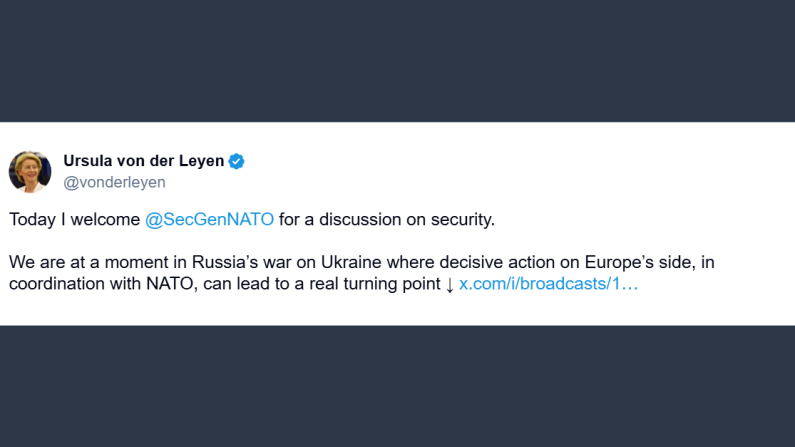 La presidente della Commissione europea, Ursula von der Leyen, commentando l’incontro di oggi con Mark Rutte, ha scritto su X: «Oggi ricevo il Segretario generale della Nato per un confronto sulla sicurezza. Ci troviamo in un momento cruciale della guerra della Russia contro l’Ucraina, in cui un’azione decisa da parte dell’Europa, in coordinamento con la Nato, può rappresentare una vera svolta».