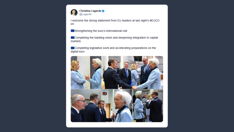 Il presidente della Banca Centrale europea, Christine Lagarde, ha scritto su X: «accolgo con favore la dichiarazione decisa dei presidenti dell’Unione europea durante il Consiglio europeo di ieri sera sul rafforzamento del ruolo internazionale dell’euro, la finalizzazione dell’unione bancaria e l’approfondimento dell’integrazione nei mercati dei capitali, la conclusione dei lavori legislativi e l’accelerazione dei preparativi per l’euro digitale».