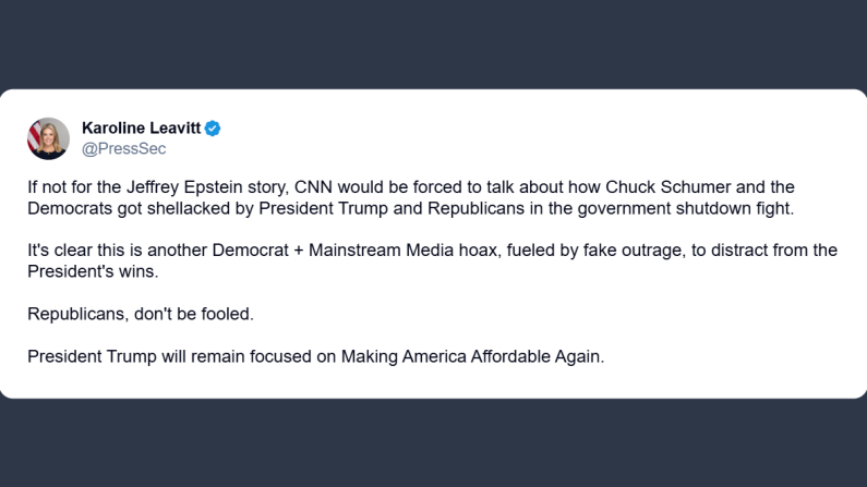 Il portavoce della Casa Bianca, Karoline Leavitt, ha scritto su X: «se non fosse per la vicenda Jeffrey Epstein, la Cnn dovrebbe parlare di come Chuck Schumer e i democratici siano stati surclassati dal presidente Trump e dai repubblicani nella disputa sullo shutdown del Governo. È evidente che si tratta dell’ennesima montatura democratica e dei media mainstream, alimentata da indignazione fasulla, per distrarre dalle vittorie del presidente. Repubblicani, non cadete nel tranello. Il presidente Trump resterà concentrato sul rendere di nuovo grande l’America».