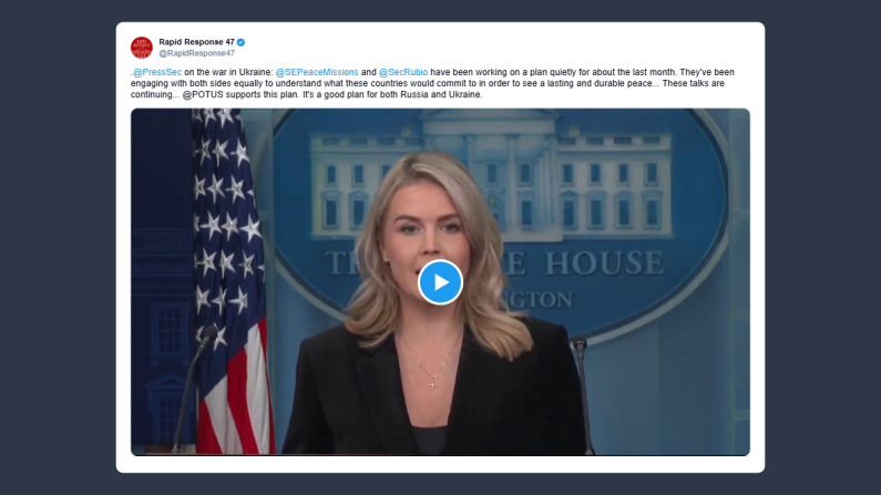 La Casa Bianca ha scritto ieri su via Rapid Response 47 la seguente dichiarazione della portavoce della Casa Bianca, Karoline Leavitt, sul conflitto in Ucraina: «I rappresentanti speciali per la pace e il ministro degli Esteri Marco Rubio lavorano a un piano in modo riservato da circa un mese. Hanno intrattenuto contatti equilibrati con entrambe le parti per capire quali impegni Russia e Ucraina sarebbero disposte ad assumere per una pace duratura e solida. I colloqui proseguono. Il presidente sostiene questo piano. È un buon piano sia per la Russia sia per l’Ucraina».