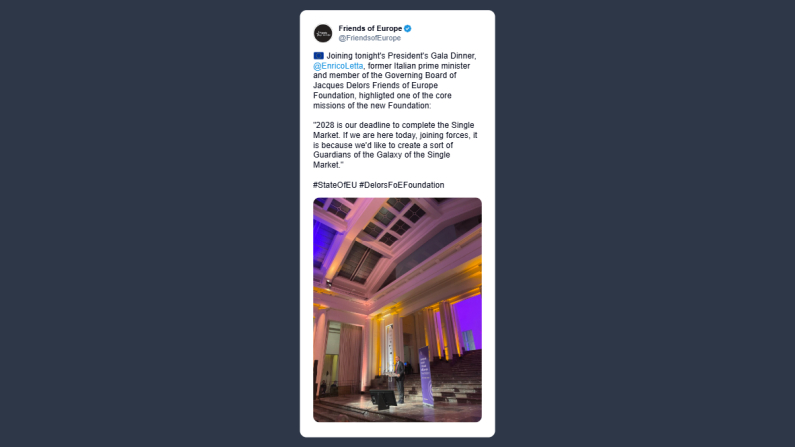 Intervenendo alla cena di gala dei presidenti, l’ex presidente del Consiglio Enrico Letta e membro del consiglio direttivo della Fondazione Amici di Jacques Delors, ha posto l’accento su una delle missioni principali della nuova fondazione: «Il 2028 è la nostra scadenza per completare il mercato unico. Se oggi siamo qui, unendo le forze, è perché vogliamo creare una sorta di Guardiani della Galassia del mercato unico».