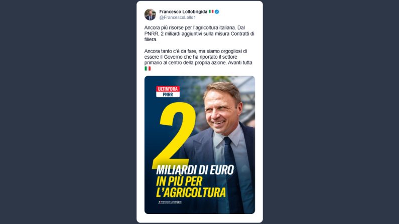 Francesco Lollobrigida ministro dell’Agricoltura, della Sovranità alimentare e delle Foreste, annuncia su X: «Ancora più risorse per l’agricoltura italiana. Dal Pnrr, 2 miliardi aggiuntivi sulla misura Contratti di filiera. Ancora tanto c’è da fare, ma siamo orgogliosi di essere il Governo che ha riportato il settore primario al centro della propria azione. Avanti tutta».