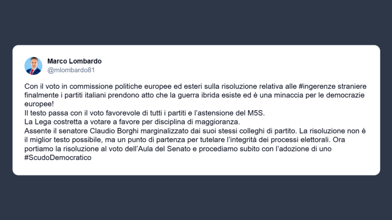 «Con il voto in commissione politiche europee ed esteri sulla risoluzione relativa alle ingerenze straniere finalmente i partiti italiani prendono atto che la guerra ibrida esiste ed è una minaccia per le democrazie europee! Il testo passa con il voto favorevole di tutti i partiti e l’astensione del M5S. La Lega costretta a votare a favore per disciplina di maggioranza. Assente il senatore Claudio Borghi marginalizzato dai suoi stessi colleghi di partito. La risoluzione non è il miglior testo possibile, ma un punto di partenza per tutelare l’integrità dei processi elettorali. Ora portiamo la risoluzione al voto dell’Aula del Senato e procediamo subito con l’adozione di uno Scudo Democratico».