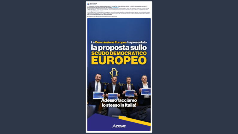 «La Commissione europea ha presentato questa mattina la proposta sullo scudo democratico europeo, in linea con gli orientamenti politici e con il discorso sullo stato dell’Unione pronunciato dalla Presidente Von der Leyen. Il Centro europeo per la Resilienza Democratica che riunirà le competenze e le risorse dell’UE e degli Stati membri per accrescere la nostra capacità collettiva di anticipare, individuare e rispondere alle minacce ibride è pienamente in linea con la nostra proposta di istituire i comitati di analisi per il monitoraggio delle ingerenze straniere. Ora è urgente che in Parlamento si avvii l’iter legislativo della nostra proposta per istituire uno scudo democratico nazionale. Le minacce ibride di guerra cognitiva si fanno sempre più gravi e frequenti: l’Italia ha bisogno di dotarsi degli strumenti per difendere l’integrità dei processi democratici e tutelare il libero convincimento degli elettori dalle ingerenze straniere».