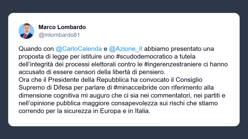 Il segretario della Presidenza del Senato, Marco Lombardo, ha scritto ieri su X: «Quando con Carlo Calenda e Azione abbiamo presentato una proposta di legge per istituire uno scudo democratico a tutela dell’integrità dei processi elettorali contro le ingerenze straniere ci hanno accusato di essere censori della libertà di pensiero. Ora che il Presidente della Repubblica ha convocato il Consiglio Supremo di Difesa per parlare di minacce ibride con riferimento alla dimensione cognitiva mi auguro che ci sia nei commentatori, nei partiti e nell’opinione pubblica maggiore consapevolezza sui rischi che stiamo correndo per la sicurezza in Europa e in Italia».