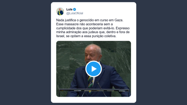 Lula da Silva presidente del Brasile, scrive su X: «Nulla giustifica il genocidio in corso a Gaza. Questo massacro non avverrebbe senza la complicità di chi avrebbe potuto impedirlo. Esprimo la mia ammirazione per gli ebrei che, dentro e fuori Israele, si oppongono a questa punizione collettiva».