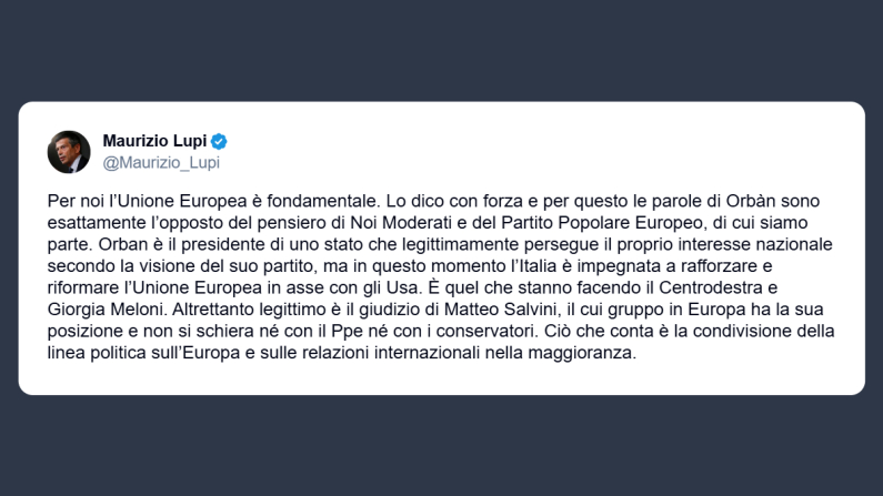 Il segretario di Noi Moderati, Maurizio Lupi, ha scritto ieri su X: «per noi l’Unione europea è fondamentale. Lo dico con forza e per questo le parole di Orbàn sono esattamente l’opposto del pensiero di Noi Moderati e del Partito Popolare Europeo, di cui siamo parte. Orban è il presidente di uno stato che legittimamente persegue il proprio interesse nazionale secondo la visione del suo partito, ma in questo momento l’Italia è impegnata a rafforzare e riformare l’Unione europea in asse con gli Usa. È quel che stanno facendo il Centrodestra e Giorgia Meloni. Altrettanto legittimo è il giudizio di Matteo Salvini, il cui gruppo in Europa ha la sua posizione e non si schiera né con il Ppe né con i conservatori. Ciò che conta è la condivisione della linea politica sull’Europa e sulle relazioni internazionali nella maggioranza».