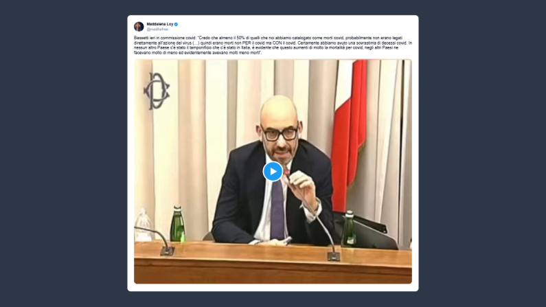 La giornalista Maddalena Loy, ex funzionaria a Bruxelles presso la direzione comunicazione del Parlamento europeo, ha scritto su X: «Bassetti ieri in commissione covid: «credo che almeno il 50% di quelli che noi abbiamo catalogato come morti covid, probabilmente non erano legati direttamente all’azione del virus, quindi erano morti non per il covid ma con il covid. Certamente abbiamo avuto una sovrastima di decessi covid. In nessun altro Paese c’è stato il “tamponificio” che c’è stato in Italia, è evidente che questo aumenti di molto la mortalità per covid, negli altri Paesi ne facevano molto di meno ed evidentemente avevano molti meno morti».