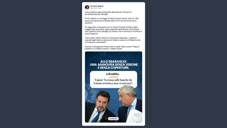 Il segretario di +Europa, Riccardo Magi, ha scritto su X: «Sulla questione degli extraprofitti delle banche il Governo è semplicemente allo sbaraglio. Prima mettono su una legge di bilancio senza visione, che non offre alcuno strumento per la crescita oltre al Pnrr che terminerà l’anno prossimo, poi – prosegue Magi – aggravano la situazione con lo scontro frontale all’interno della maggioranza sulla tassa sugli extraprofitti delle banche che dimostra che il Governo è allo sbaraglio più totale e che la manovra al momento è senza coperture».