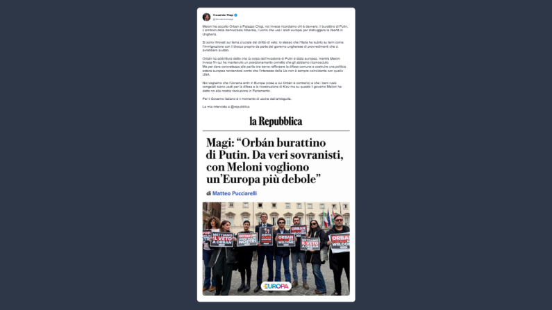 Il segretario di +Europa, Riccardo Magi, ha riportato oggi su X la sua intervista a la Repubblica: «Meloni ha accolto Orban a Palazzo Chigi, noi invece ricordiamo chi è davvero: il burattino di Putin, il simbolo della democrazia illiberale, l’uomo che usa i soldi europei per distruggere la libertà in Ungheria. Si sono ritrovati sul tema cruciale del diritto di veto. Lo stesso che l’Italia ha subito su temi come l’immigrazione con il blocco proprio da parte del governo ungherese di provvedimenti che ci avrebbero aiutato. Orbán ha addirittura detto che la colpa dell’invasione di Putin è stata europea, mentre Meloni invece fin qui ha mantenuto un posizionamento corretto che gli abbiamo riconosciuto. Ma per dare concretezza alle parole ora serve rafforzare la difesa comune e costruire una politica estera europea rendendosi conto che l’interesse della Ue non è sempre coincidente con quello Usa. Noi vogliamo che l’Ucraina entri in Europa (cosa a cui Orbán è contrario) e che i beni russi congelati siano usati per la difesa e la ricostruzione di Kiev ma su questo il governo Meloni ha detto no alla nostra risoluzione in Parlamento. Per il Governo italiano è il momento di uscire dall’ambiguità».