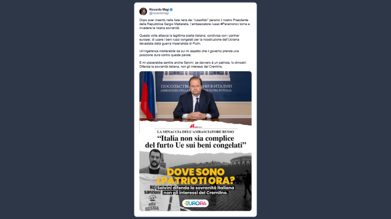 «Dopo aver inserito nella lista nera dei “russofobi” persino il nostro Presidente della Repubblica Sergio Mattarella, l’ambasciatore russo Paramonov torna a invadere la nostra sovranità. Questa volta attacca la legittima scelta italiana, condivisa con i partner europei, di usare i beni russi congelati per la ricostruzione dell’Ucraina devastata dalla guerra imperialista di Putin. Un’ingerenza intollerabile da cui mi aspetto che il governo prenda una posizione dura contro queste parole. E mi piacerebbe sentire anche Salvini: se davvero è un patriota, lo dimostri. Difenda la sovranità italiana, non gli interessi del Cremlino».