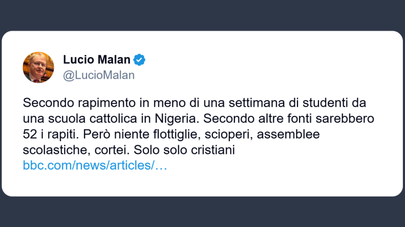 Il presidente dei senatori di Fratelli d’Italia, Lucio Malan, ha scritto ieri su X: «secondo rapimento in meno di una settimana di studenti da una scuola cattolica in Nigeria. Secondo altre fonti sarebbero 52 i rapiti. Però niente flottiglie, scioperi, assemblee scolastiche, cortei. Sono solo cristiani».