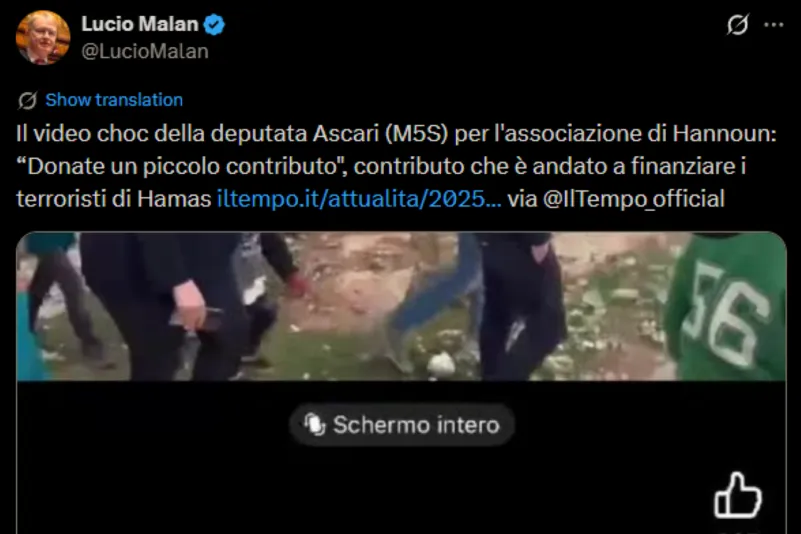 Il presidente Gruppo Fratelli d’Italia Lucio Malan ha condiviso su X il video choc de Il Tempo del deputato Ascari (M5S) per l’associazione di Hannoun: «donate un piccolo contributo, contributo che è andato a finanziare i terroristi di Hamas».