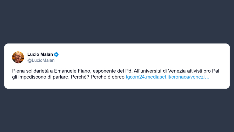 Il presidente dei senatori di Fratelli d’Italia, Lucio Malan, ha scritto su X: «piena solidarietà a Emanuele Fiano, esponente del Pd. All’università di Venezia attivisti Pro Pal gli impediscono di parlare. Perché? Perché è ebreo».