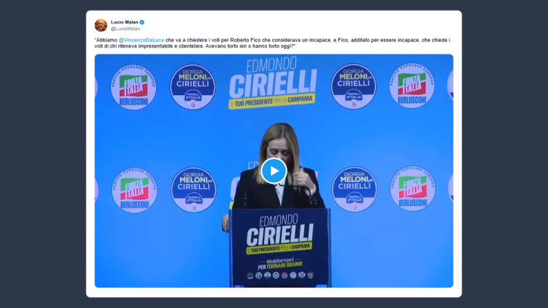 «Abbiamo Vincenzo De Luca che va a chiedere i voti per Roberto Fico che considerava un incapace, e Fico, additato per essere incapace, che chiede i voti di chi riteneva impresentabile e clientelare. Avevano torto ieri o hanno torto oggi?».