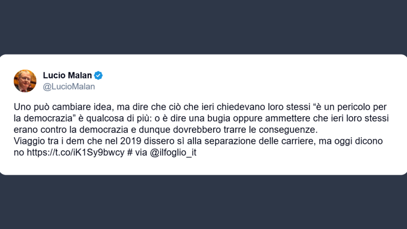 Il presidente dei senatori di Fratelli d’Italia, Lucio Malan, ha scritto su X: «uno può cambiare idea, ma dire che ciò che ieri chiedevano loro stessi “è un pericolo per la democrazia” è qualcosa di più, o è dire una bugia, oppure ammettere che ieri loro stessi erano contro la democrazia e dunque dovrebbero trarre le conseguenze. Viaggio tra i Dem che nel 2019 dissero sì alla separazione delle carriere, ma oggi dicono no via Il Foglio».