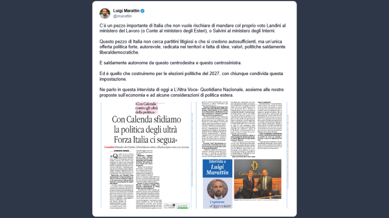 «C’è un pezzo importante di Italia che non vuole rischiare di mandare col proprio voto Landini al ministero del Lavoro (o Conte al ministero degli Esteri), o Salvini al ministero degli Interni. Questo pezzo di Italia non cerca partitini litigiosi e che si credono autosufficienti, ma un’unica offerta politica forte, autorevole, radicata nei territori e fatta di idee, valori, politiche saldamente liberaldemocratiche. E saldamente autonome da questo centrodestra e questo centrosinistra. Ed è quello che costruiremo per le elezioni politiche del 2027, con chiunque condivida questa impostazione».