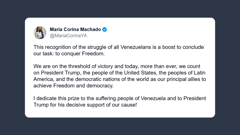 «Questo riconoscimento della lotta di tutti i venezuelani è uno stimolo per completare la nostra missione: conquistare la libertà. Siamo al confine della vittoria e oggi, più che mai, contiamo sul presidente Donald Trump, sul popolo degli Stati Uniti, sui popoli dell’America Latina e sulle nazioni democratiche del mondo come nostri principali alleati per raggiungere la libertà e la democrazia. Dedico questo premio al popolo venezuelano che soffre e al presidente Donald Trump per il suo decisivo sostegno alla nostra causa!».