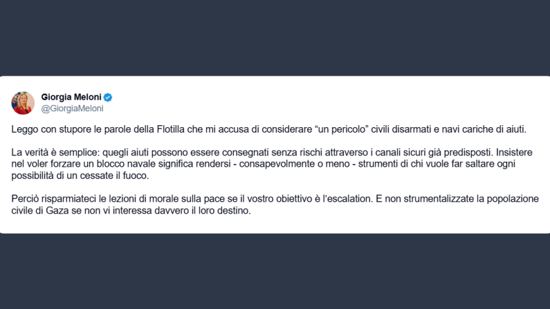 Il presidente del Consiglio, Giorgia Meloni, ha scritto ieri su X: «leggo con stupore le parole della Flotilla che mi accusa di considerare “un pericolo” civili disarmati e navi cariche di aiuti». Ma la verità, afferma il capo del Governo, è semplice: quegli aiuti possono essere consegnati senza rischi attraverso i canali sicuri già predisposti. «Insistere nel voler forzare un blocco navale significa rendersi – consapevolmente o meno – strumenti di chi vuole far saltare ogni possibilità di un cessate il fuoco». La Meloni ha poi concluso affermando: «risparmiateci le lezioni di morale sulla pace se il vostro obiettivo è l’escalation. E non strumentalizzate la popolazione civile di Gaza se non vi interessa davvero il loro destino».